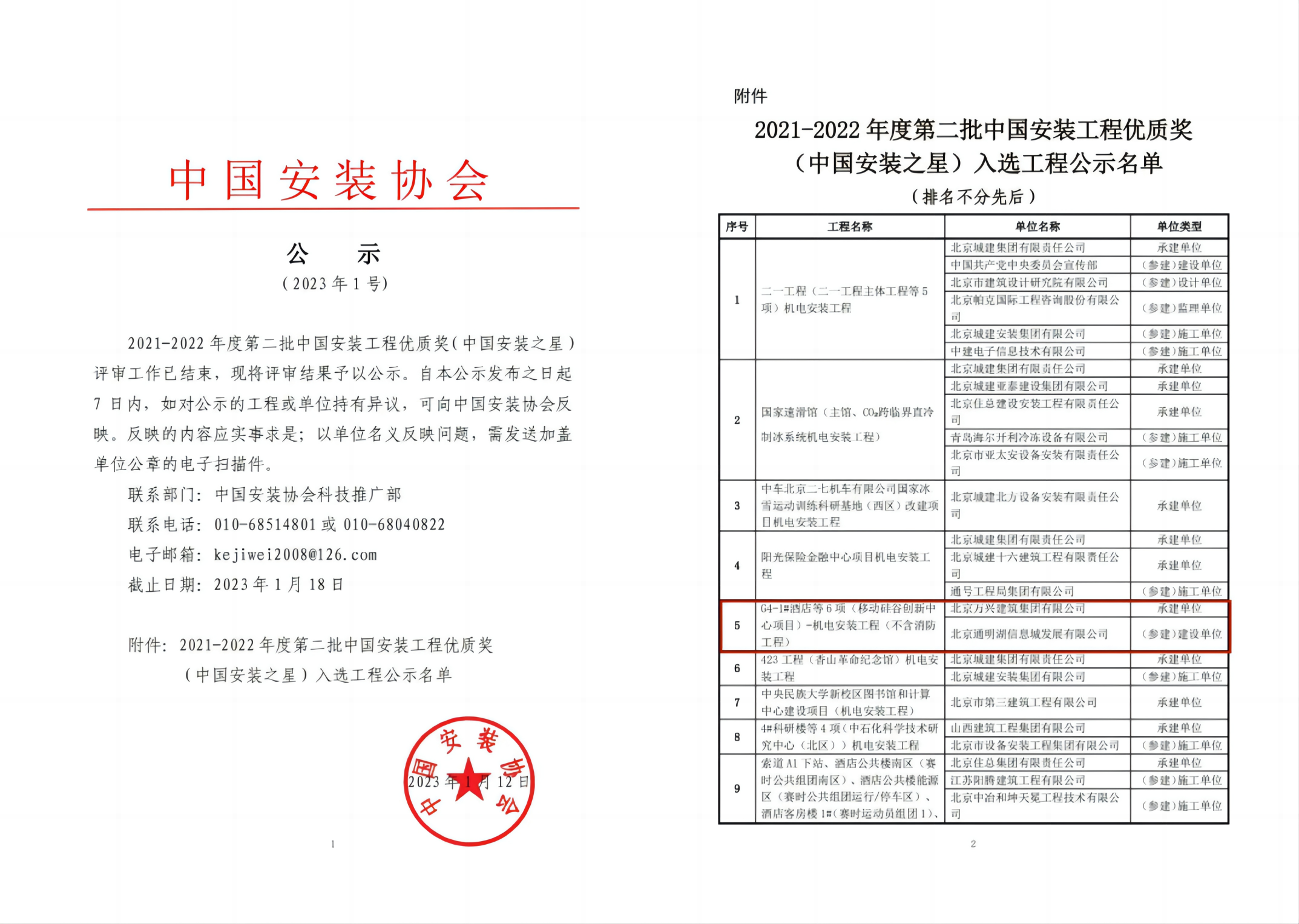 近日,中國安裝協(xié)會(huì)公布了2021~2022年度第二批中國安裝工程優(yōu)質(zhì)獎(jiǎng)(中國安裝之星)入選名單,由北京萬興集團(tuán)十五分公司承建的G4-1#酒店等6項(xiàng)(移動(dòng)硅谷創(chuàng)新中心項(xiàng)目)成功摘“星”,為萬興集團(tuán)再添1項(xiàng)國家級獎(jiǎng)項(xiàng)。