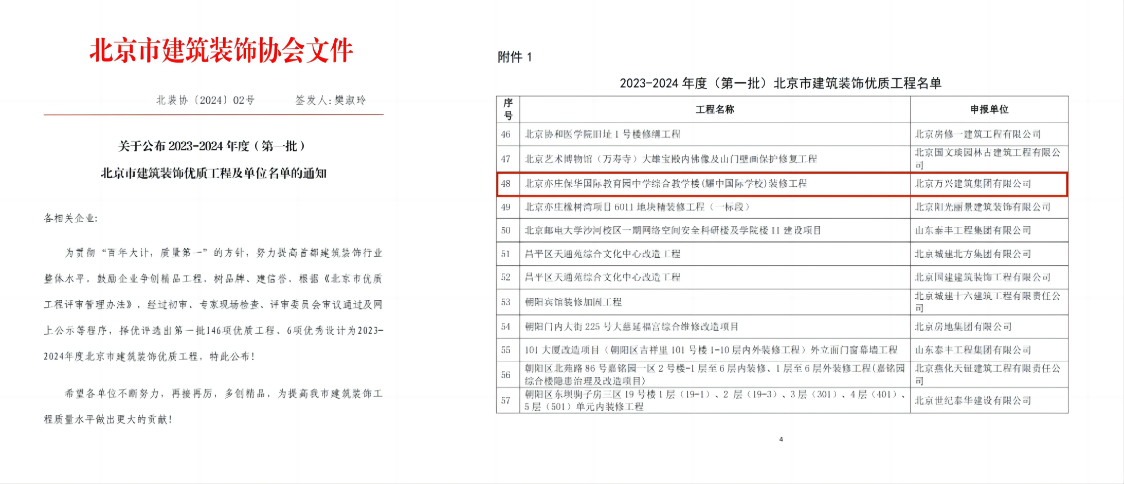 2024年1月24日,北京市建筑裝飾協(xié)會(huì)公布了2023-2024年度(第一批)北京市建筑裝飾優(yōu)質(zhì)工程及單位名單,由集團(tuán)施工的北京亦莊保華國(guó)際教育園中學(xué)綜合教學(xué)樓(耀中國(guó)際學(xué)校)裝修工程榮列其中,獲得了北京市建筑裝飾優(yōu)質(zhì)工程獎(jiǎng),為集團(tuán)又增添一項(xiàng)裝飾優(yōu)質(zhì)工程獎(jiǎng)。